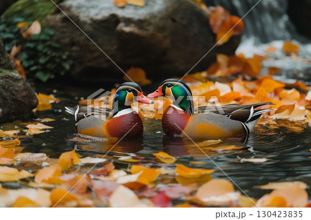 Two colorful wood ducks swimming among fallen autumn leaves, with reflection of vibrant foliage in the water