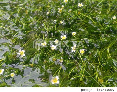 透明な水に揺れる水辺の花々