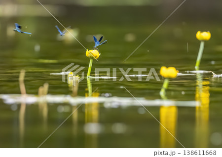 Blue damselfly resting on yellow water lily