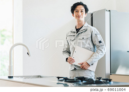 キッチンの点検をする作業員 男性