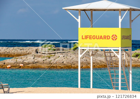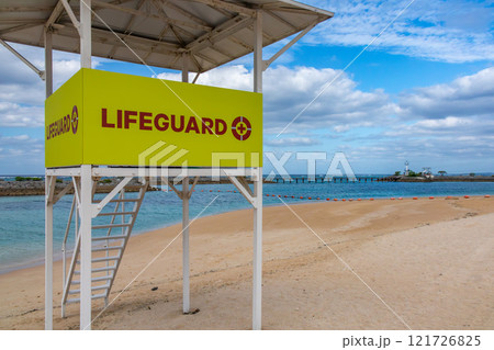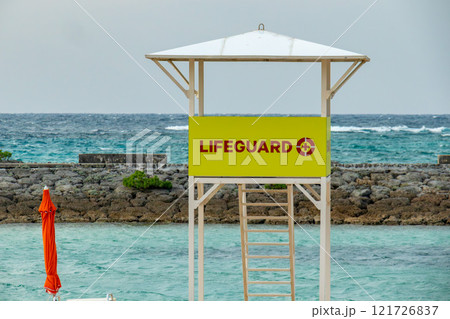 沖縄の青い空と青い海、ビーチの安全を守る監視台