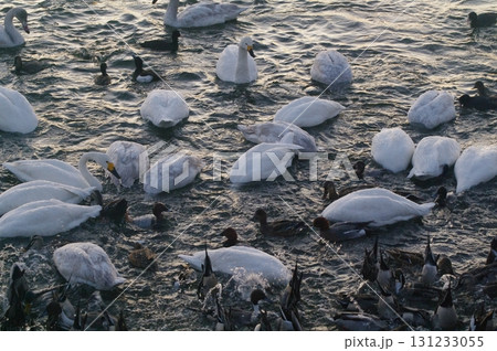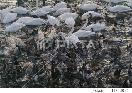 夜明け前から餌場に向かい、我先にと餌に食いつく白鳥などの水鳥