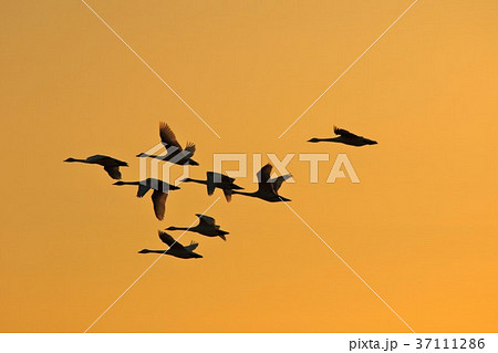 夕焼けの中家路へ急ぐ白鳥たち