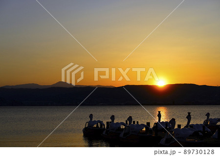 春の夕日が沈む諏訪湖と足漕ぎボート
