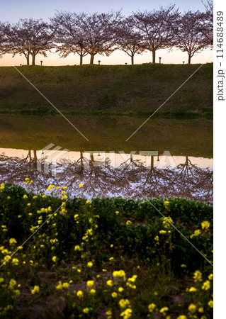 水面に映る幻想的な逆さ桜 春の長等公園(滋賀県大津市)