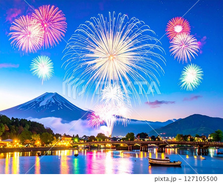 夜の湖の桟橋で犬とともに花火を見上げる人