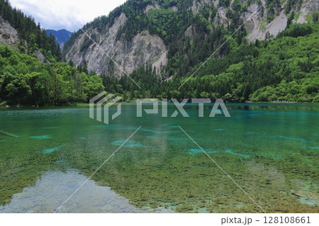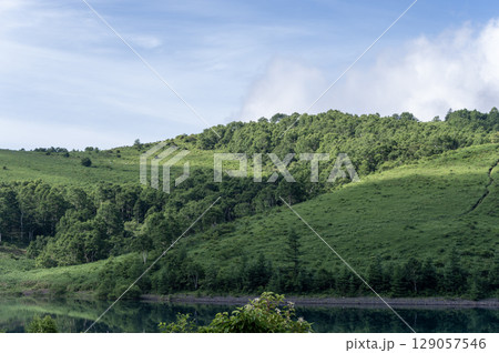 水面に映る森と雲:エメラルドグリーンの湖が魅せる幻想的な光景