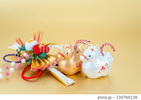 午年 年賀素材 水引とかわいい白午の親子 金色バック