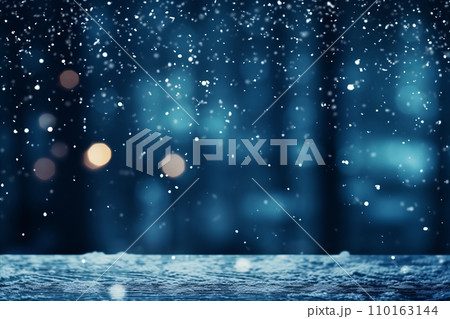 Snowy winter background with snowflakes, snow bokeh, and snowdrifts under sunset sky