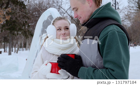 Romantic couple embracing winter moment, drinking hot beverages near snow covered ice sculpture, sharing loving glance in cold park setting