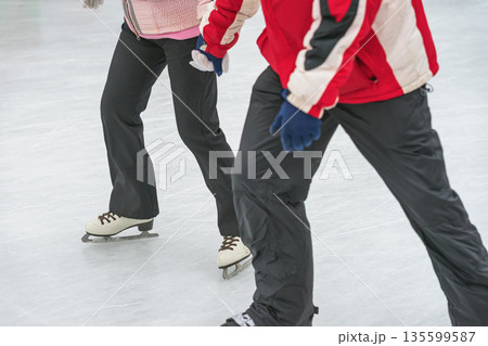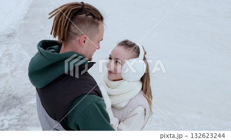 Two people holding hands while ice skating together on winter rink. Concept of shared skating experience, active date skating, friendship, seasonal winter sport