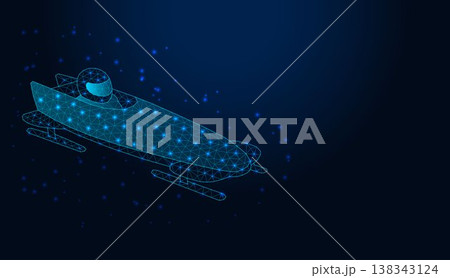 Abstract low poly wireframe bobsleigh with athlete on dark blue background.