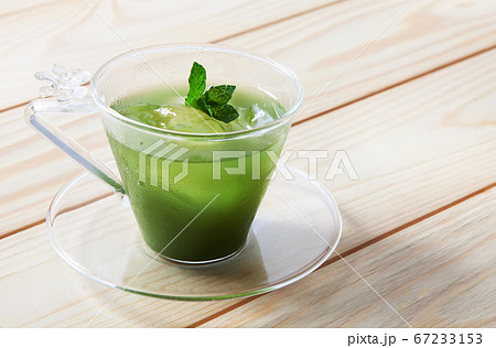 白板のテーブルにプラスチックのコップにはいったマンゴースムージーのアップ