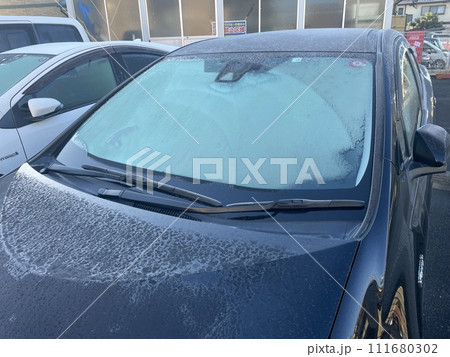 氷点下の冬に凍った車のフロントガラスとボンネット