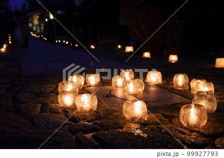 馬籠、氷雪の灯祭りの氷灯篭と石畳の街並み