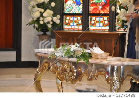 結婚式場で指輪交換する新郎新婦(結婚指輪・マリッジリング・・ウェディング・ブライダル)