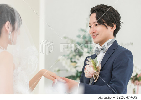結婚式場で指輪交換する新郎新婦(結婚式・ウェディング・ブライダル)