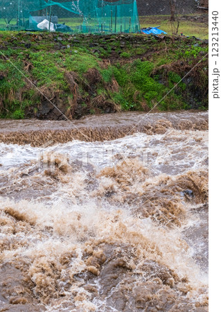 濁って増水した木曽川の濁流 川の洪水と氾濫