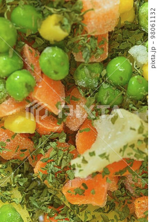 Close-up view of the frozen soup vegetables with carrots, peas, cauliflower, corn and parsley. Texture of frozen soup vetetables. Macro image of frozen soup vegetables. Frozen soup vegetables ready to