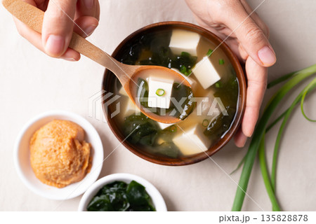 Top view of hand holding spoon and eating healthy Japanese miso soup with soft tofu and seaweed