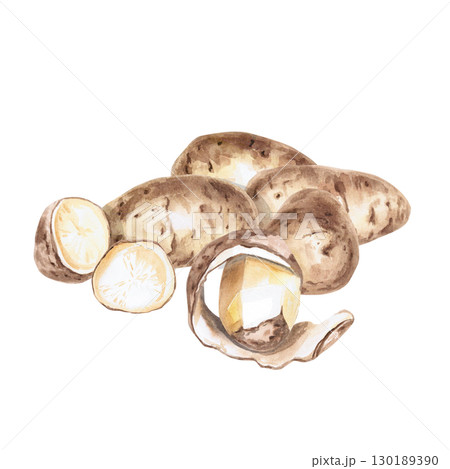 A pile of whole and cut potato tubers. Isolated watercolor illustration on the theme of vegetables for the design of seed packaging, restaurant menus, culinary recipes, labels.