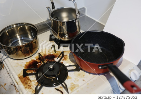 頑固な焦げ付きと油汚れが目立つガスコンロ