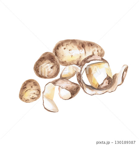 A pile of whole and peeled potatoes. Isolated watercolor illustration on the theme of vegetables for the design of seed packaging, restaurant menus, culinary recipes, labels.