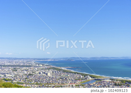 湘南の街並み(平塚・茅ヶ崎・藤沢・鎌倉)と相模湾に浮かぶ江ノ島