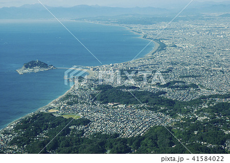 日本の藤沢都市景観 江の島周辺・片瀬海岸の街並みなどを望む