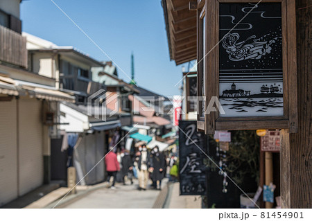 神奈川県藤沢市 江の島弁財天仲見世通りと江の島アイランドスパ入口と青空