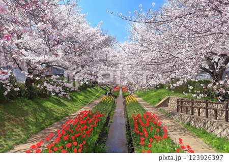 【神奈川県】江川せせらぎ緑道の桜とチューリップの競演