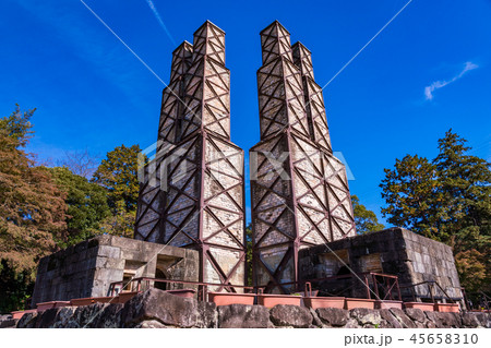 静岡県観光スポット・韮山反射炉南東方向から南A炉B炉の煙突と下部鋳口と焚口・縦位置