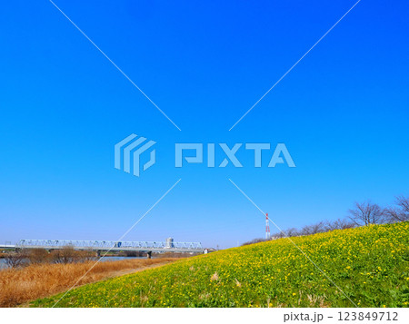 春の国府台江戸川河川敷から見た鉄橋と菜の花