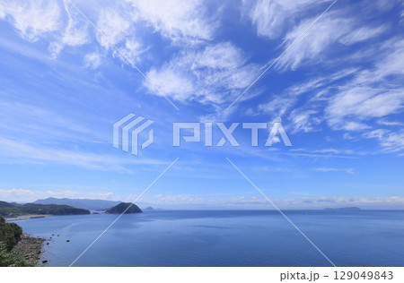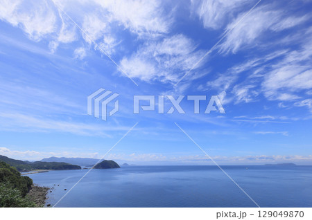 三豊市荘内半島の紫雲出山登山口付近の海沿いから眺める荘内半島西側の海岸と燧灘に浮かぶ伊吹島