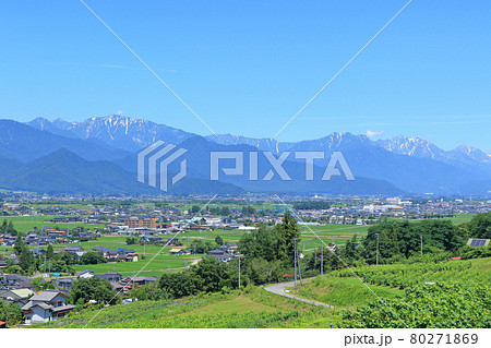 北アルプス展望美術館から眺める北アルプス連山と池田町、長野県北安曇郡池田町にて