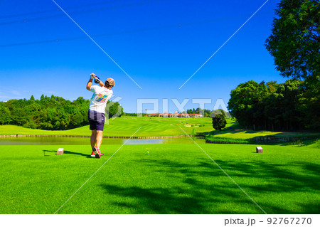 ゴルフ場のティグラウンドで池越えのドライバーショットを打つ男性の後姿(千葉県木更津市)