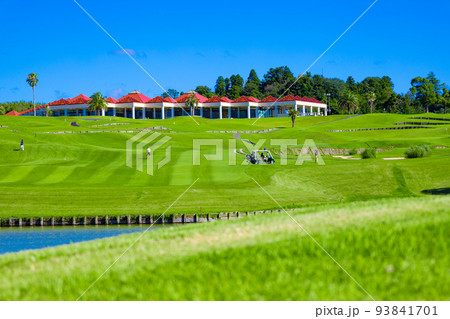 青空のゴルフ場・池越えグリーンのコースの眺めのパノラマ(千葉県木更津市)