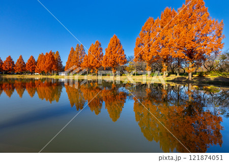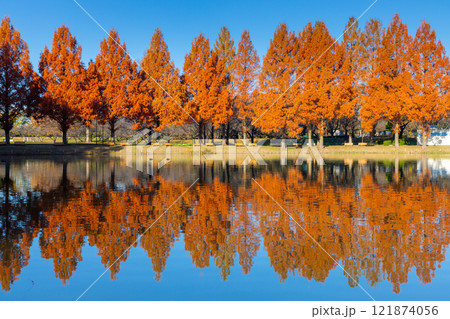 埼玉県川越市池辺 川越水上公園 ボート池周りのメタセコイヤ並木の紅葉と池の水鏡