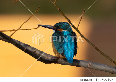 埼玉県川越市池辺 川越水上公園 修景池(ボート池)の水辺の枝にとまり羽繕いするカワセミ