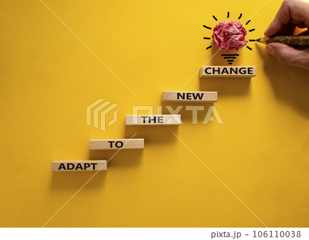 Adapt to the new change symbol. Wooden blocks with words Adapt to the new change on beautiful yellow background, copy space. Businessman hand, light bulb icon. Business, adapt to change concept.