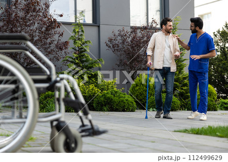 Dark-skinned young smiling disabled woman in a wheelchair near the office building