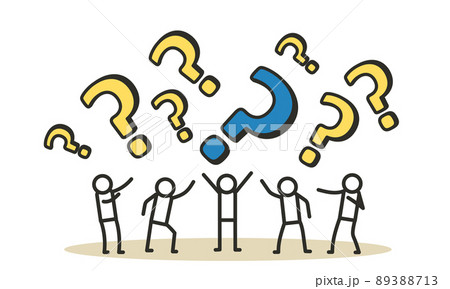 businessman stick figure character showing a small question mark on hand. problem solve, finding solution, business thinking to make decision concept. hand drawn style vector doodle illustration
