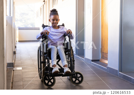 Smiling african american girl in wheelchair moving through school hallway, enjoying her day