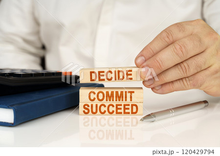 In the hands of a businessman, wooden blocks with the inscription - DECIDE COMMIT SUCCEED