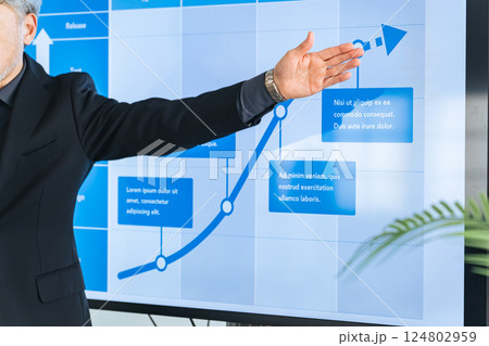 大画面モニターの前で説明するミドルエイジ男性ビジネスパーソン