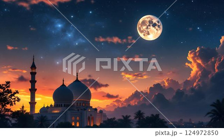 The crescent moon and a star can be seen above a mosque, symbolizing the core of Ramadan in an Islamic framework