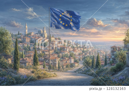 A picturesque landscape features a large European Union flag fluttering in the breeze amidst rolling hills. Quaint houses line the winding road, with mountains in the background bathed in sunset hues.