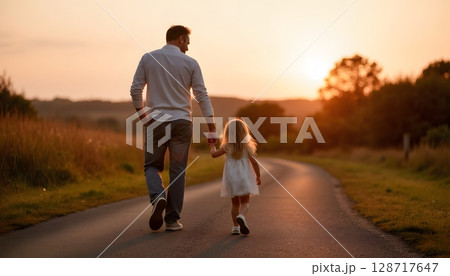 Father and daughter walking hand in hand along a winding road during a beautiful sunset
