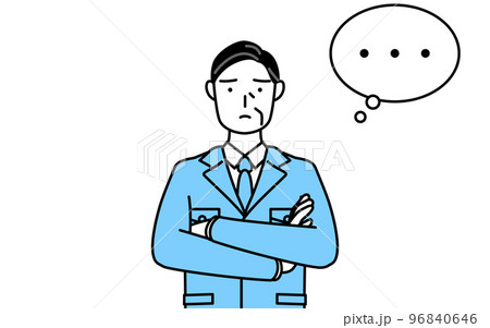 腕を組んで考える作業着を着た男性(経営者、管理職、工場長)