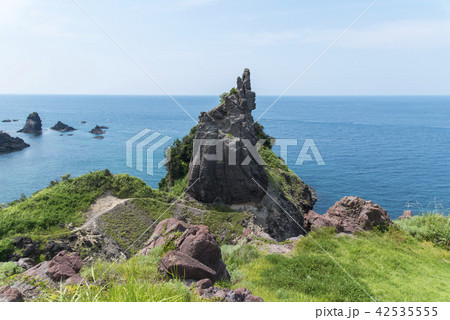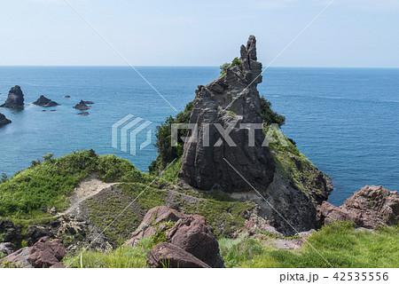 日本海の水平線を背景に島根半島北端にそびえ立つ多古の石柱 Ver1